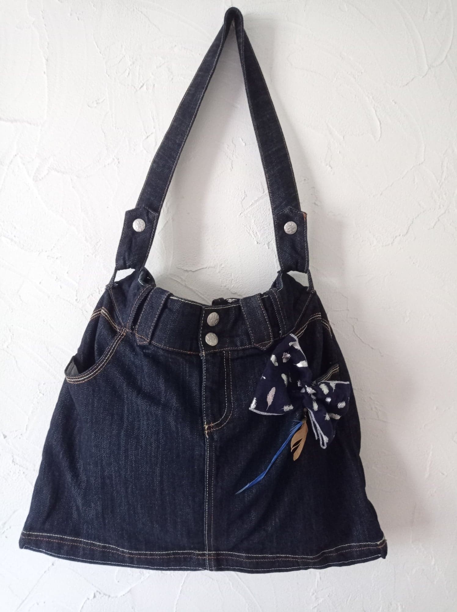Sac en matière extérieure en jean brute de marque ROXY et intérieure coton marine à motifs plumes.